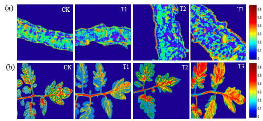 图2番茄叶片中SOD分布的可视化。(a)微观预测模型;(b)宏观预测模型。
