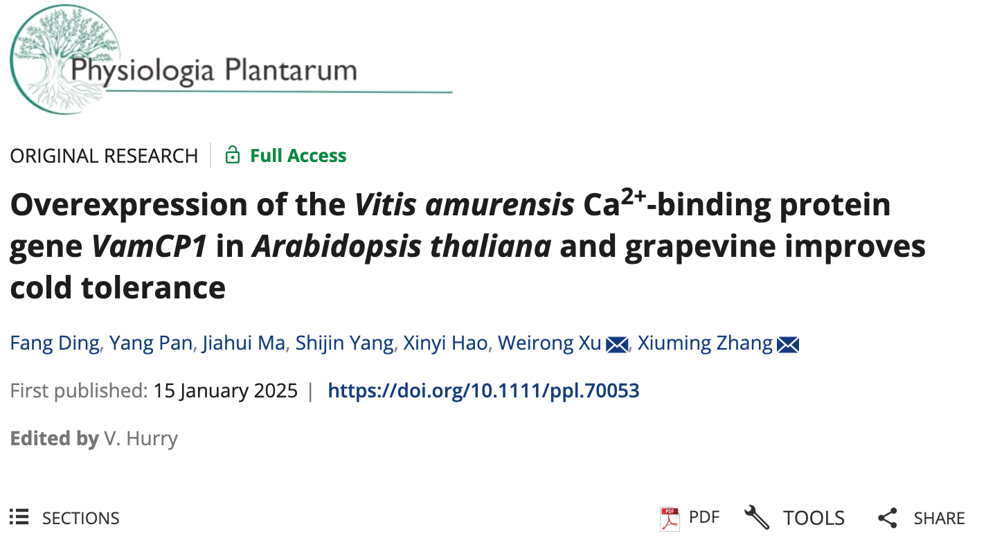【beat365唯一官方网站新闻中心讯 葡萄酒与园艺学院】近日,beat365唯一官方网站葡萄酒与园艺学院葡萄与葡萄酒工程(营销方向)专业2021级本科生丁芳,以第一作者撰写的论文“Overexpression of theVitis amurensis Ca2+-binding protein geneVamCP1 inArabidopsis thaliana and grapevine improves cold tolerance”在国际SCI期刊《Physiologia Plantarum》(中科院2区,IF=5.4)上发表。这是beat365官网本科生专业建设、学科建设、人才培养进一步提升的体现。