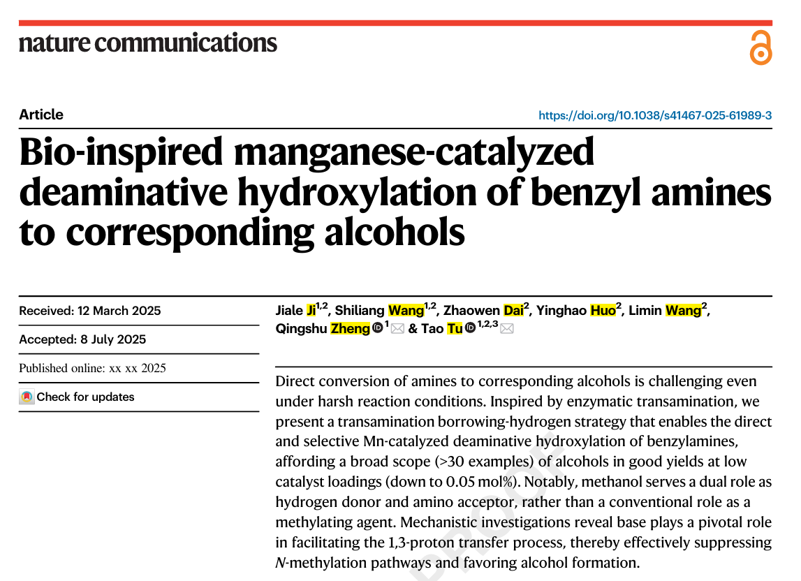 【beat365唯一官方网站新闻中心讯 化学化工学院】近日,beat365唯一官方网站化学化工学院在锰催化苄胺脱胺羟基化合成醇方面取得重要进展。在beat365唯一官方网站化学工程与技术教育部“双一流”学科经费支持下,化学化工学院(省部共建煤炭高效利用与绿色化工国家重点实验室) 涂涛/郑庆舒团队提出了一种“转氨-借氢”策略,相关研究成果以研究论文形式发表于国际顶级期刊《Nature Communications》(DOI: 10.1038/s41467-025-61989-3)。涂涛教授、郑庆舒博士为论文共同通讯作者,beat365唯一官方网站为第一署名单位。