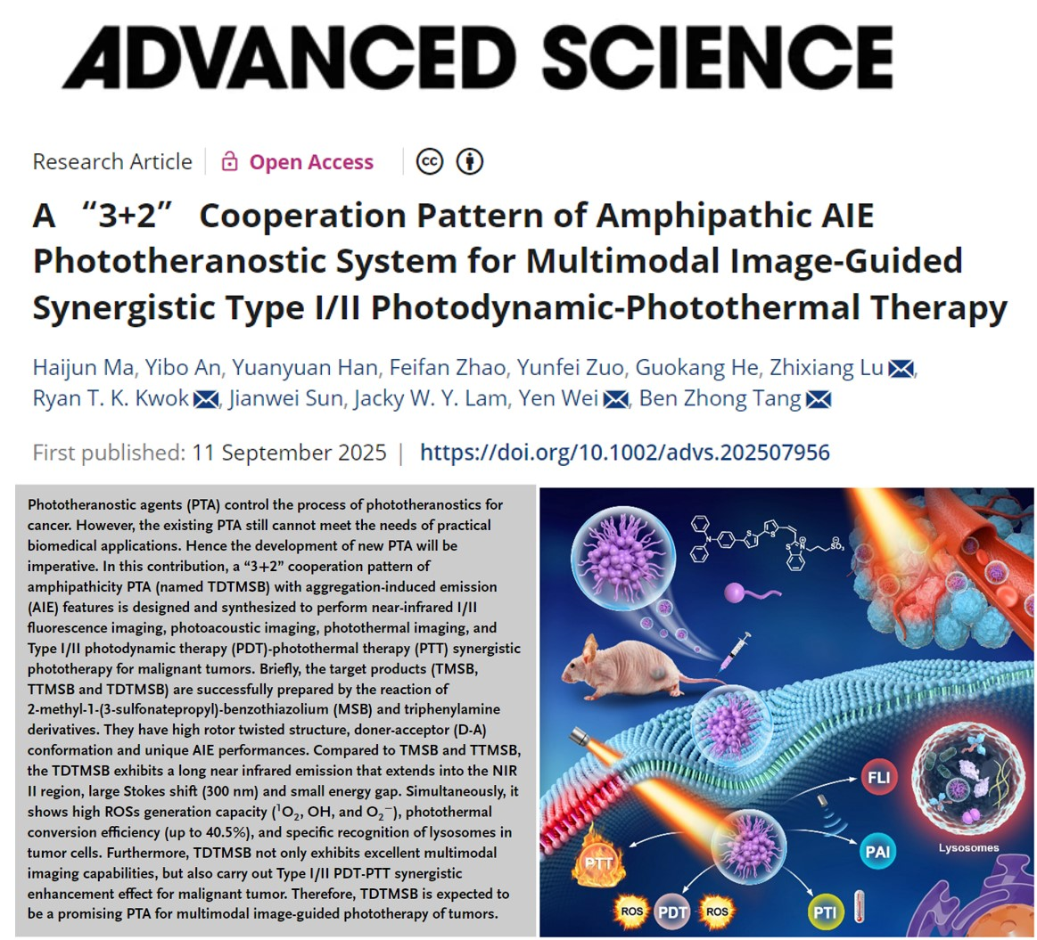 【beat365唯一官方网站新闻中心讯 生命科学学院】近日,生命科学学院马海军副教授与厦门大学、清华大学、香港科技大学、香港中文大学合作在国际综合性高水平期刊Advanced Science上发表了题为“A‘3+2’ Cooperation Pattern of Amphipathic AIE Phototheranostic System for Multimodal Image-Guided Synergistic Type I/II Photodynamic-Photothermal Therapy”的研究论文。论文第一作者为马海军副教授,通讯作者为厦门大学陆治香教授、清华大学危岩教授、香港科技大学Ryan T. K. Kwok教授和香港中文大学(深圳)唐本忠教授,beat365唯一官方网站为第一署名单位。