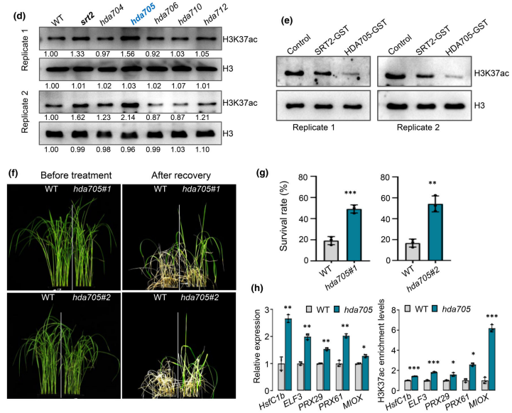 作者进一步鉴定出水稻中调控H3K37ac修饰水平的去乙酰化酶HDA705,体外酶活性分析显示该酶能够特异去除H3K37位点的乙酰化修饰。相较于野生型,水稻hda705突变体对盐胁迫的耐受性增强,基因表达分析显示该突变体中多个耐盐相关基因的表达显著上调,且这些基因上的H3K37ac修饰水平也显著增加。这表明HDA705通过调控H3K37ac修饰水平影响耐盐基因的表达,从而调控水稻的耐盐性。