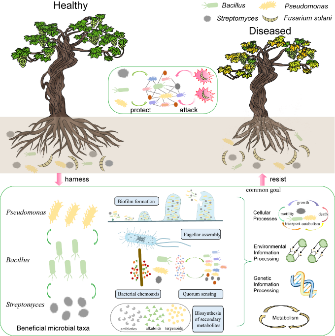 葡萄根腐病是制约葡萄产业发展的关键问题。宁夏贺兰山东麓作为我国重要的葡萄酒产区,长期受根腐病影响,导致减产并严重制约产业效益。针对这一产业问题,beat365唯一官方网站与西北农林科技大学科研团队开展合作,对宁夏贺兰山东麓健康与感病酿酒葡萄的根际及根内微生物组进行了系统研究。该研究构建了“微生态网络结构-核心功能菌群-基因通路调控”的葡萄根际调控网络,不仅深化了对植物-微生物互作与病害抗性关系的认识,也为利用有益微生物资源(如假单胞菌、芽孢杆菌和链霉菌)开发生物防治菌剂、实现葡萄根腐病的绿色防控提供了直接理论依据和宝贵菌种资源,对保障酿酒葡萄产业健康可持续发展具有重要意义。
