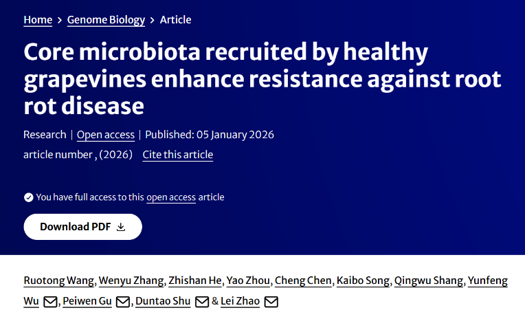 【beat365唯一官方网站新闻中心讯 农学院】近日,beat365唯一官方网站联合西北农林科技大学在国际权威学术期刊《Genome Biology》(Impact = 9.4, 5年平均影响因子16.3)上联合发表题为《Core microbiota recruited by healthy grapevines enhance resistance against root rot disease》的研究论文,揭示了贺兰山东麓酿酒葡萄根际有益微生物的招募机制与功能途径。该成果标志着东西部高校在农业前沿研究领域的强强联合取得实质性突破,也为宁夏贺兰山东麓酿酒葡萄产业的绿色可持续发展提供了重要理论支撑与实践资源。