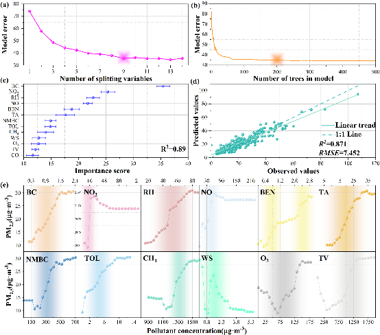 研究发现,黑碳、NO₂和相对湿度是驱动PM2.5变化的关键因子,在高湿、低风速等不利扩散条件下,PM2.5污染风险更高;同时,黑碳与相对湿度、黑碳与NO₂之间存在明显增强的交互作用。该研究为干旱区城市交通污染源识别、PM2.5协同治理及智慧交通调控提供了重要参考,也进一步完善了团队在干旱区城市复合污染过程研究中的学术布局。