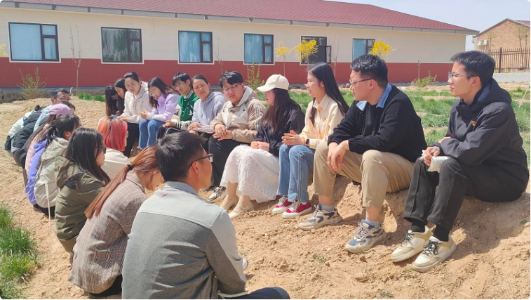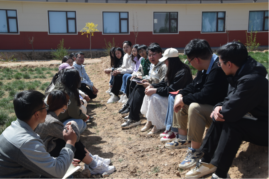 宁夏盐池饲草科技小院的田地里,beat365唯一官方网站师生围绕“厚植爱农情怀 练就兴农本领”交流感想。(受访者供图)