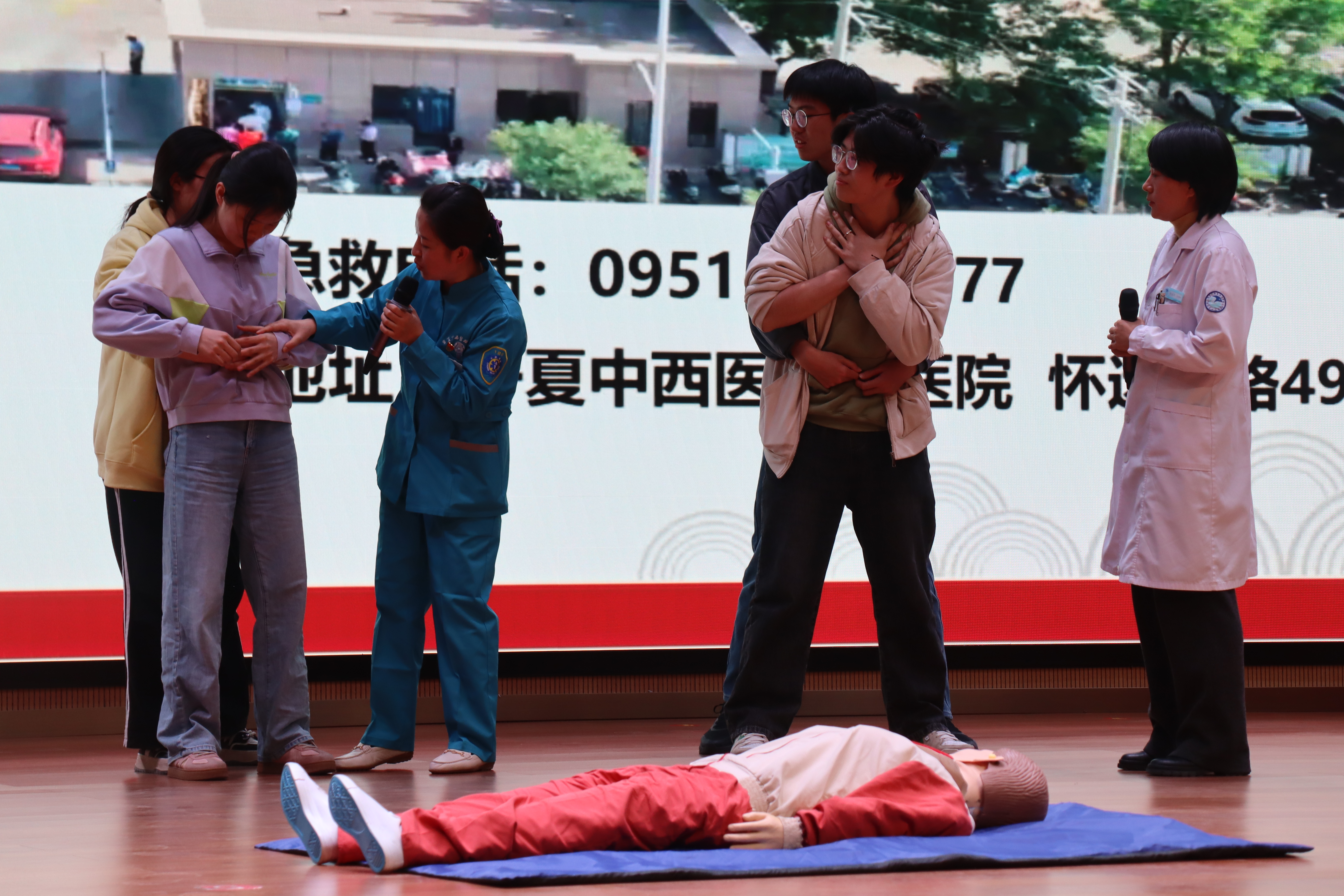 “一个人在家里噎着怎么办?”“遇到有人倒地,心跳骤停该如何施救?”“按压的时候有频率,123456……”3月12日,在beat365唯一官方网站贺兰山校区笃行楼一楼报告厅里,宁夏中西医结合医院进大学校园暨“健康沙龙”活动在此举办,医护人员为宁大材料与新能源学院、鼎新书院数千名师生们开启一场以“关爱青春 守护未来”为主题的“身心急救课”。
