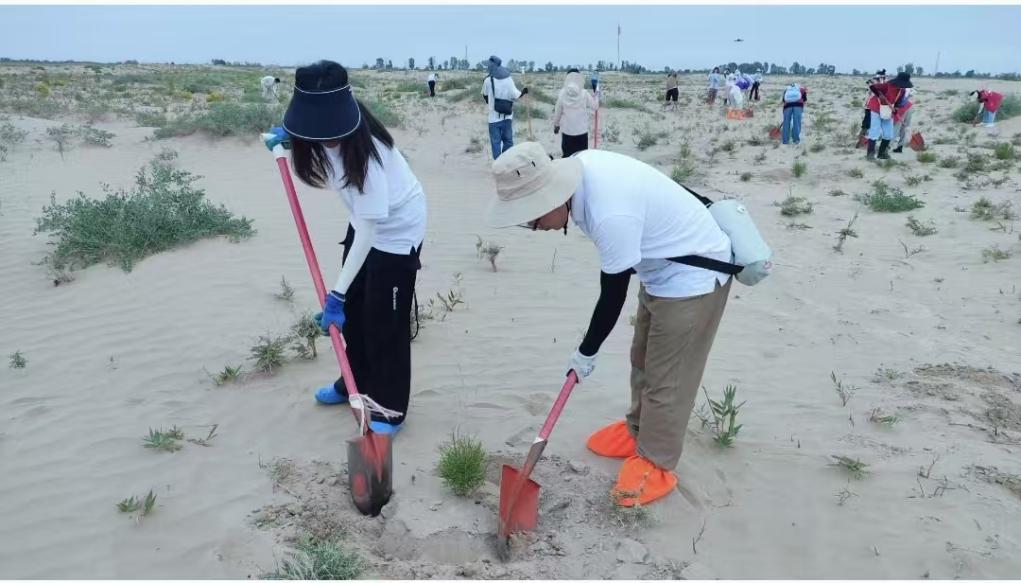 在兴隆村沙漠公益林基地,队员们不仅体验了独特的 “沙洗法”—— 用细沙旋转吸附碗中油渍,再用清水冲净,“这是沙漠里的生存智慧。” 护林员介绍道。还参与了梭梭树苗的维护工作,在护林员的指导下,学习如何为梭梭树浇水、挖坑、回填,了解到梭梭树在防风固沙中的重要作用,以及日常维护对于树苗存活和生长的关键意义。正午的阳光灼热,带着沙粒的热风拂面,队员们却干劲十足,亲身感受 “向沙宣战、向绿而行” 的艰辛。