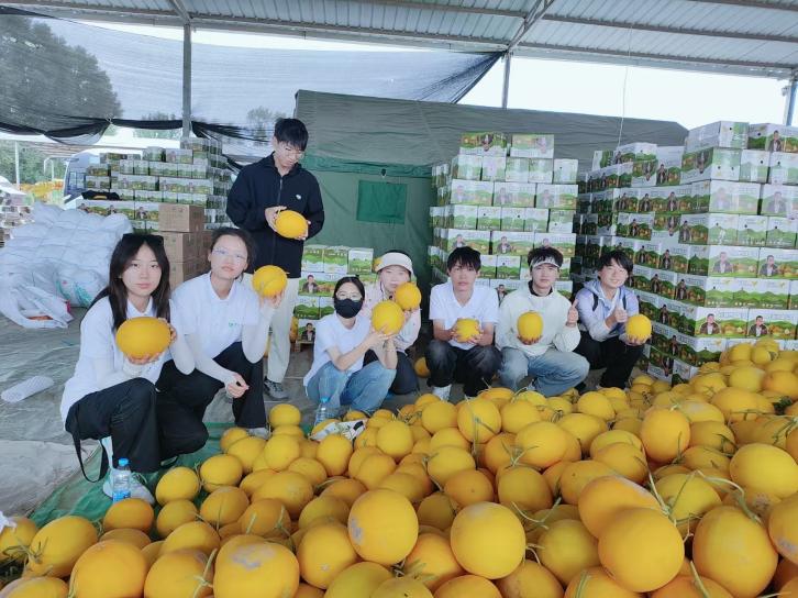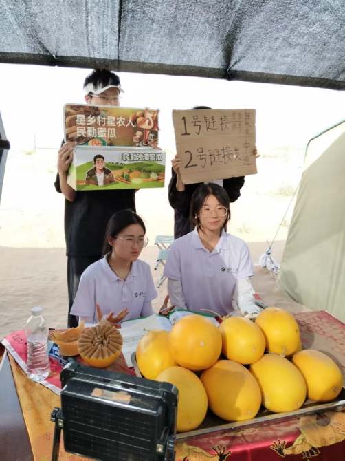 “家人们看过来,今天我们带来的是民勤特产‘金红宝’蜜瓜。大家看,它金黄色的果皮、橘红色的果肉,名字就是这么来的。” 队员们也迅速融入这份忙碌,加入直播带货的行列。镜头前,队员们熟练地向观众介绍民勤蜜瓜的特色,同时结合所学知识讲解:“民勤的蜜瓜软硬适中,更重要的是,这里昼夜温差大,光照充足,积累的糖分特别多,所以吃起来格外甜。而这每一口甜,都藏着治沙人种树护田的坚守!”