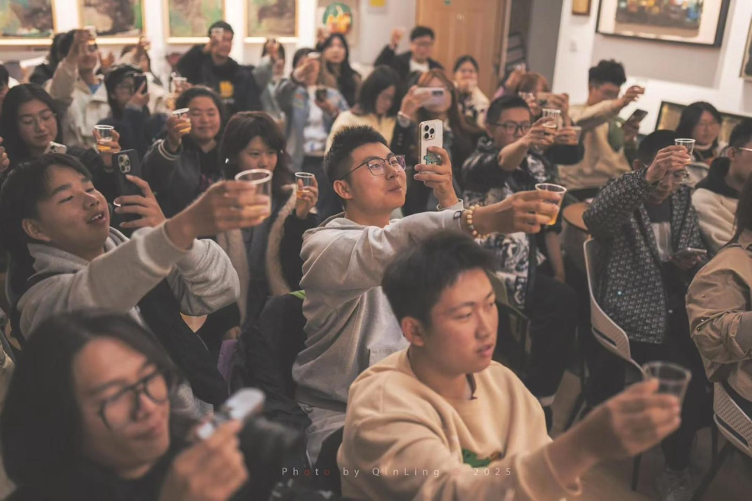 谈及未来与取舍,姚欣传递着健康饮酒的智慧,也分享着“心流”的体验——当专注于酿酒时,几个小时的时光悄然流逝,那种忘我的投入,正是热爱最动人的模样。马浩谦则从人生规划的角度提醒同学们:“不忘自我,也别忘了把时间留给家人与挚友。”活动尾声,全体师生共同举杯,马浩谦的“敬健康,敬快乐,敬自己”与同学们的“祝老师,祝青春,祝自由”在空气中交汇,温馨的氛围将这场美育之约推向高潮。