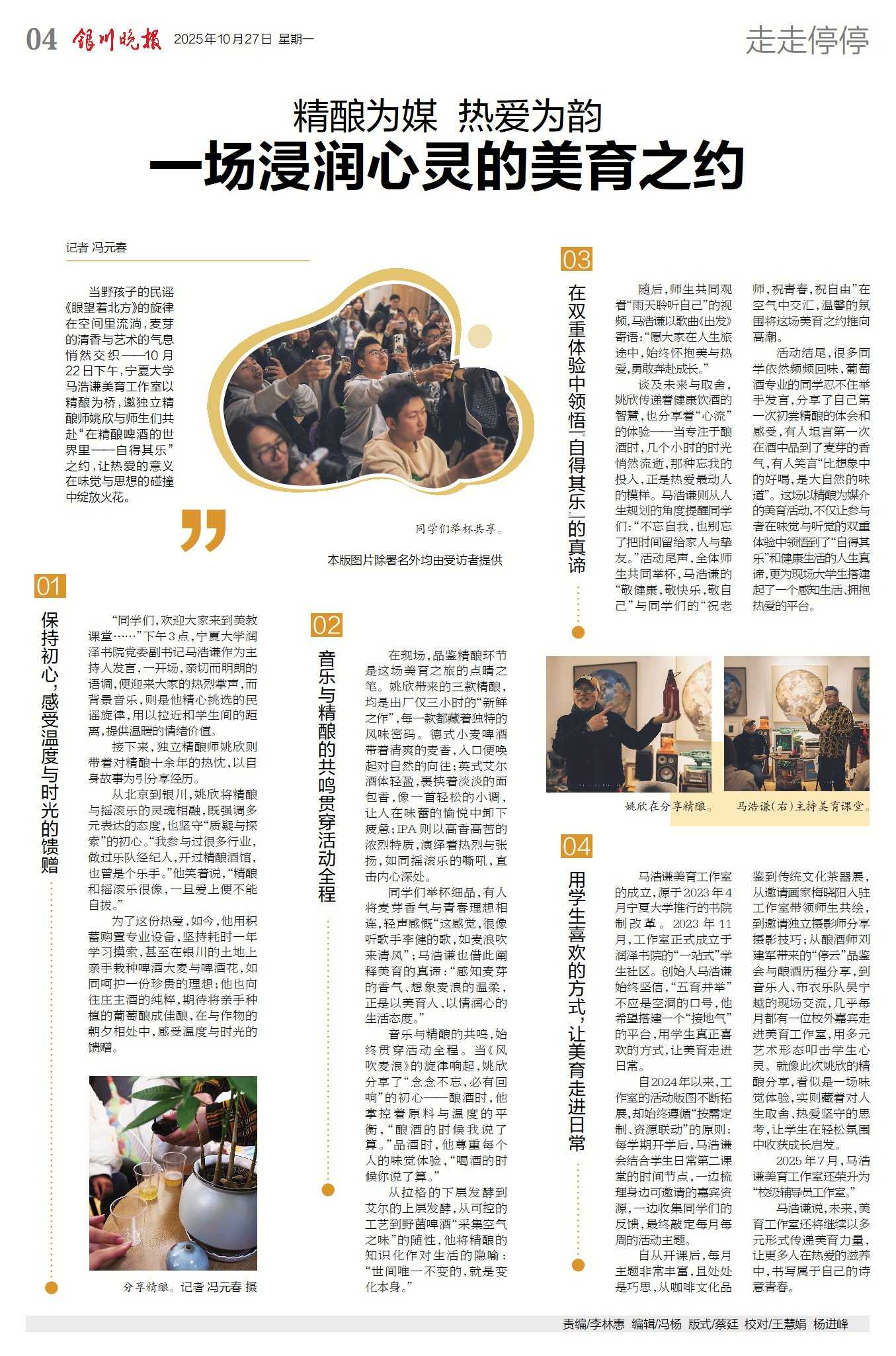 自从开课后,每月主题非常丰富,且处处是巧思,从咖啡文化品鉴到传统文化茶器展,从邀请画家梅晓阳入驻工作室带领师生共绘,到邀请独立摄影师分享摄影技巧;从酿酒师刘建军带来的“停云”品鉴会与酿酒历程分享,到音乐人、布衣乐队吴宁越的现场交流,几乎每月都有一位校外嘉宾走进美育工作室,用多元艺术形态叩击学生心灵。就像此次姚欣的精酿分享,看似是一场味觉体验,实则藏着对人生取舍、热爱坚守的思考,让学生在轻松氛围中收获成长启发。