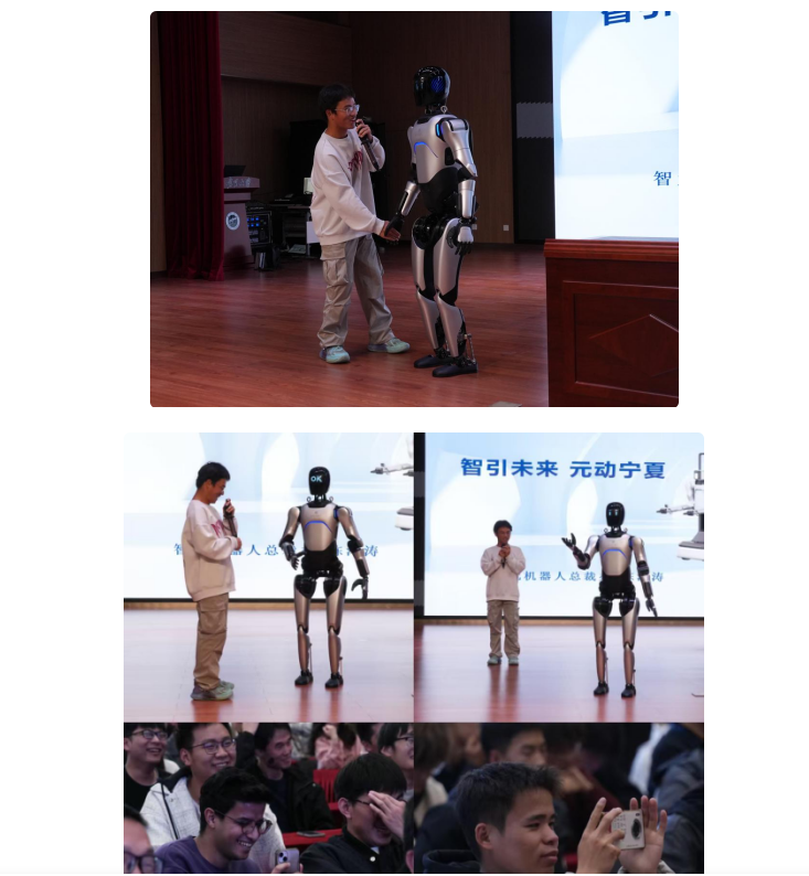 10月26日下午,被业界誉为国内人形机器人领域领军企业的“智元机器人” 宣传推介会在beat365唯一官方网站贺兰山校区笃行楼三楼报告厅顺利举办。此次活动由宁夏报业传媒集团文化科技创意有限公司组织实施,邀请智元创新(上海)科技有限公司携旗下智元远征A2交互服务机器人、D1 Ultra 四足机器人走进校园。通过现场展示、互动体验等形式,活动为beat365唯一官方网站机械工程学院及相关学院的200余名本科、研究生带来沉浸式 “人工智能实践课堂”,为智元机器人与beat365唯一官方网站的深度合作奠定基础。