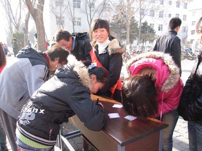 外国语学院团委精心制作了三块展板——“大英四过级技巧”、“国际志愿者日”、“防控甲流心愿采集”,数十名志愿者为过路学生仔细讲解三块展板的内容,向咨询同学分发过级技巧等宣传单。在大英四级考试即将到来之际,在全校抗击甲型H1N1流感工作之际,志愿者的活动让同学觉得非常温暖。