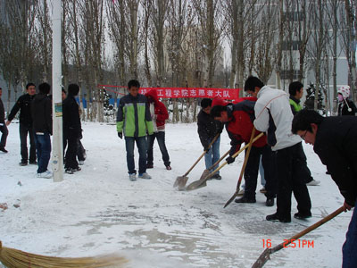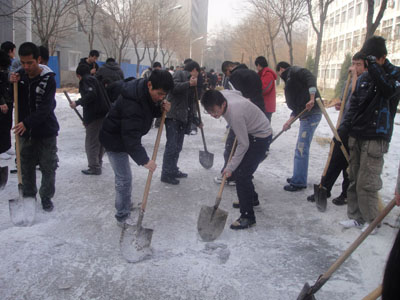 由09、08级学生组成的志愿者队伍分成三个小分队,你扫我铲、争先恐后。虽然天气寒冷,但丝毫没有减弱大家的积极性。铁锹和冰面碰击的声音和同学们相互鼓劲的号子声响彻校园,活动现场气氛热烈、团结和谐,志愿者脸上洋溢着劳动的欢乐。