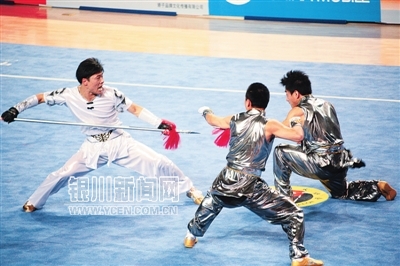 【beat365唯一官方网站新闻中心讯 体育学院】10月14日,beat365官网体育学院2006级学生马进文、黄宝光与同学左长辉合作,在第十一届全国运动会武术男子对练项目上为宁夏代表团夺得一枚银牌。