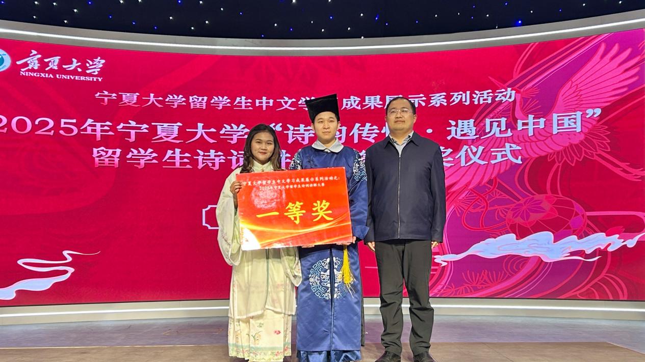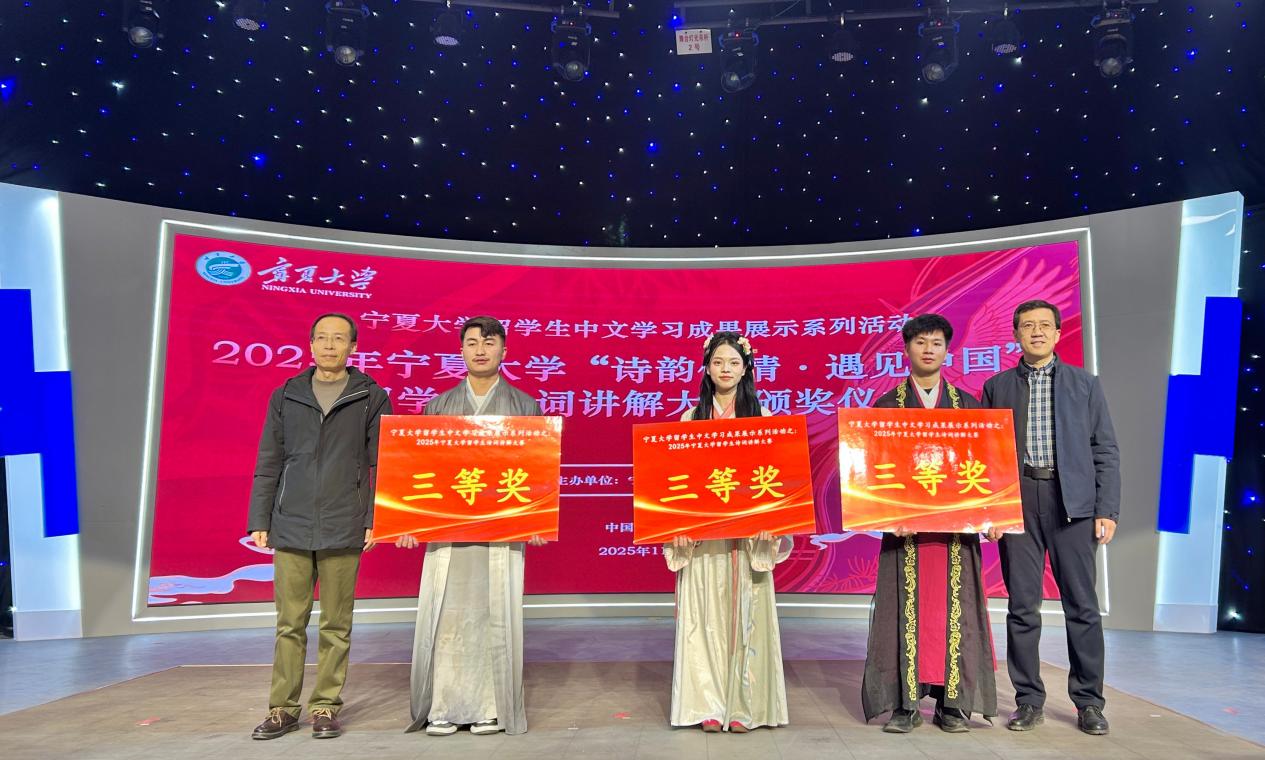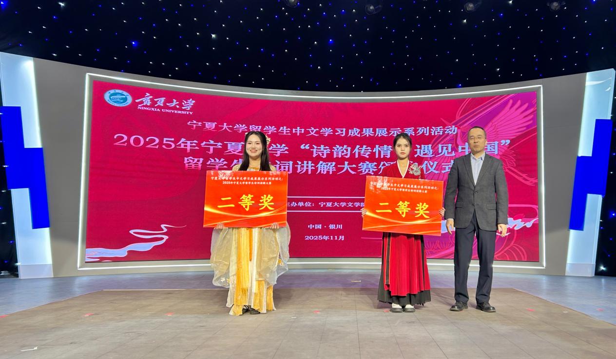【beat365唯一官方网站新闻中心讯 文学院】11月26日下午,beat365唯一官方网站“诗韵传情·遇见中国”留学生诗词讲解大赛在贺兰山校区新闻传播学院演播厅举行。本次活动由beat365唯一官方网站文学院主办,校党委常委、副校长杨文法,学校对外合作交流处、国际教育学院、文学院、音乐舞蹈学院、守正书院、尚德书院相关领导和老师与来自厄瓜多尔、印度尼西亚、越南、老挝、埃及等国的留学生们共同见证了一场以诗词为媒介、融汇中外文化的精彩盛会。