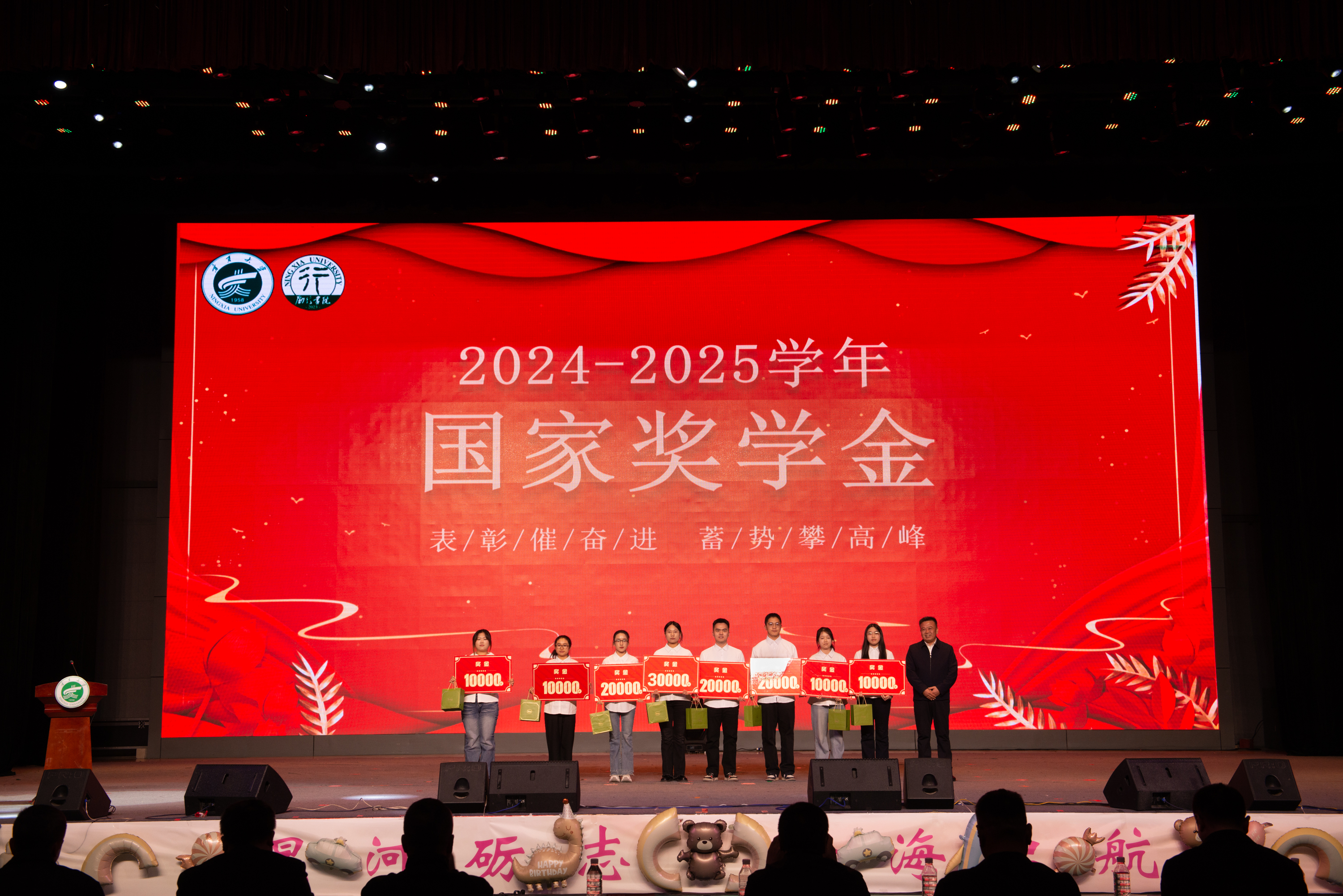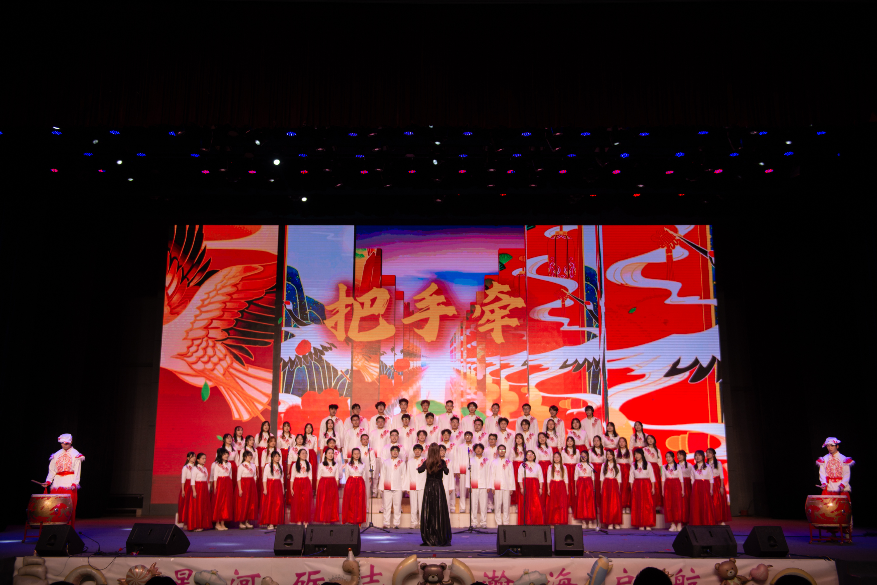 “星河砺志,瀚海起航”迎新晚会在热情洋溢的摇滚音乐氛围中拉开序幕。晚会节目编排独具匠心,从“星聚·塞上”“躬耕·瀚海”“励学·致远”三个篇章来展现。乐队、街舞、合唱、朗诵、民族舞、舞蹈串烧等14个精彩节目轮番登场,为师生呈现出一场丰富的视听盛宴。观众们情绪高涨、热血沸腾。最后,晚会在舞蹈《相亲相爱》的演绎中落下帷幕。