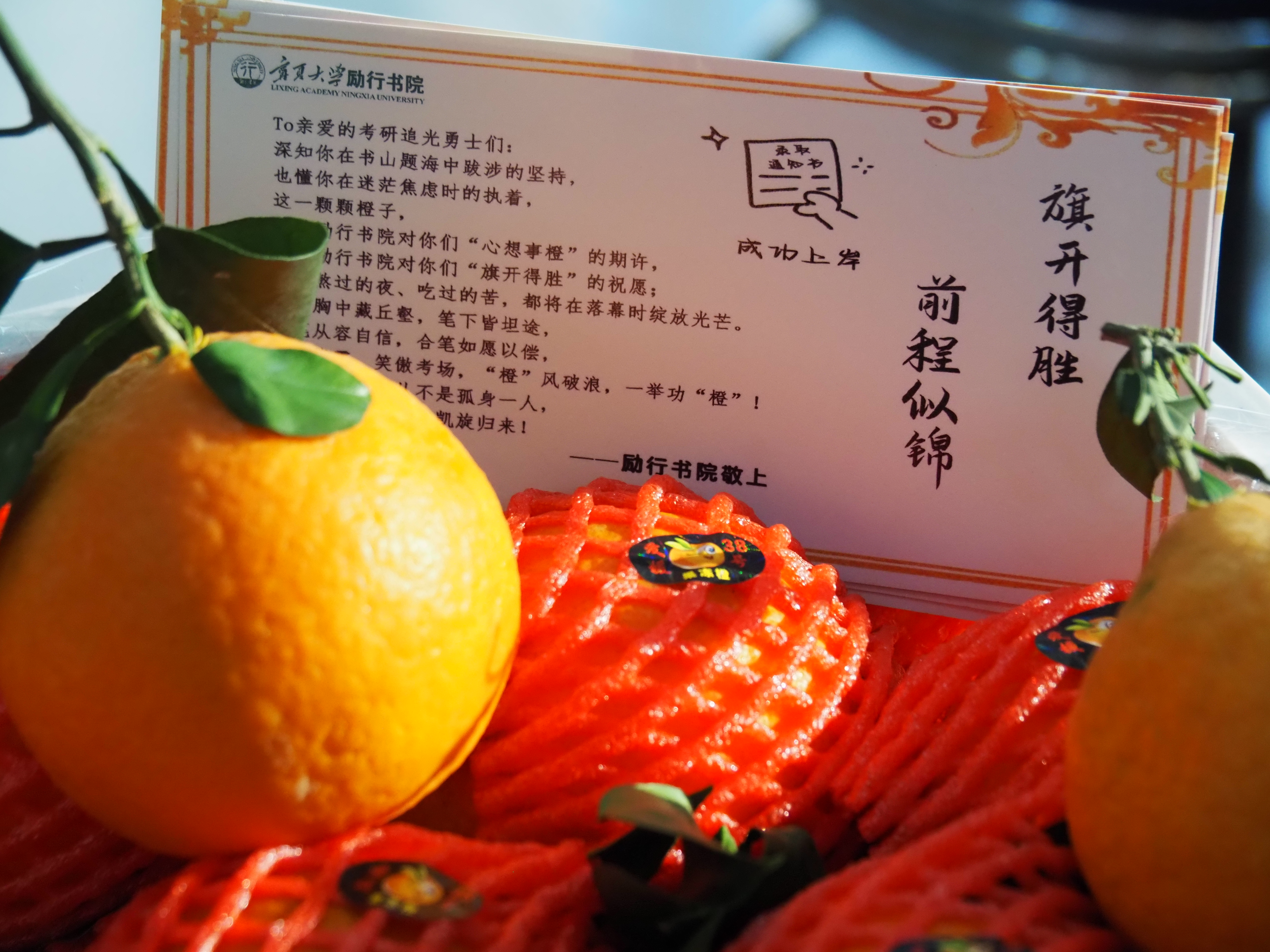 书院在文萃校区3号楼学业空间、6号楼先锋之家、13号楼党建社区、15号楼学习研讨室和贺兰山校区2号宿舍楼分别放置了“心想事成”的鲜橙领取处。现场志愿者们定制励志贺卡和鲜橙送到考研学生的手中。祝愿同学剥开橙香,也剥开一份笃定;打开贺卡,也打开一页祝福。同时,书院在书院学生宿舍区、小广场等公共区域悬挂励志标语与暖心海报6条,营造沉浸式备考氛围。