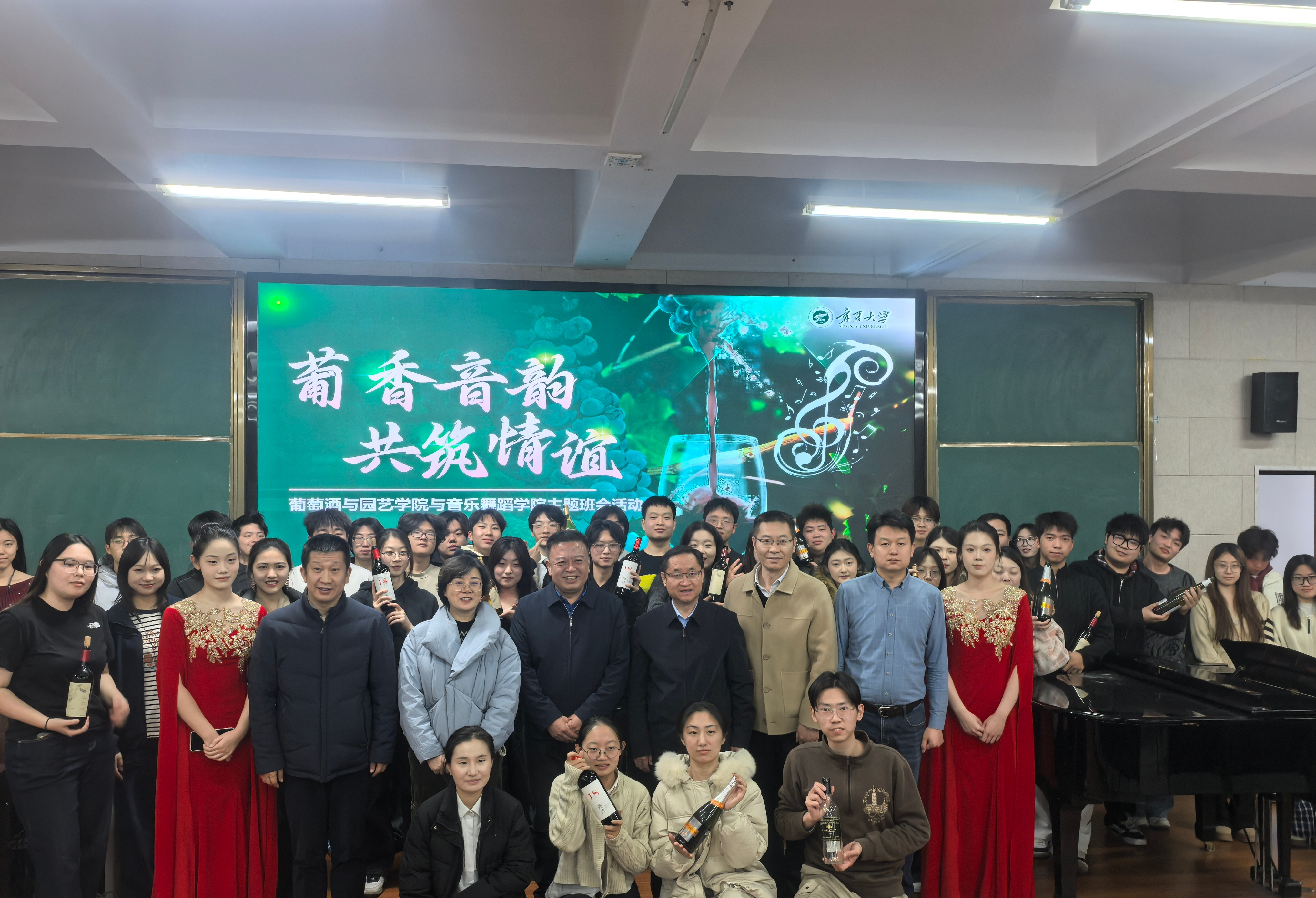展示环节,葡萄酒与园艺学院学生引导品鉴六款中外佳酿,解读其风土与工艺。音乐舞蹈学院学生则带来古筝、二胡、吉他等演奏,曲目与酒品特质相呼应,体现“道技相生”的匠心。互动环节中,音乐竞猜、团队协作游戏等趣味活动接连开展,不仅增进了两学院学生对彼此专业的认知理解,更有效锤炼了团队协作能力。