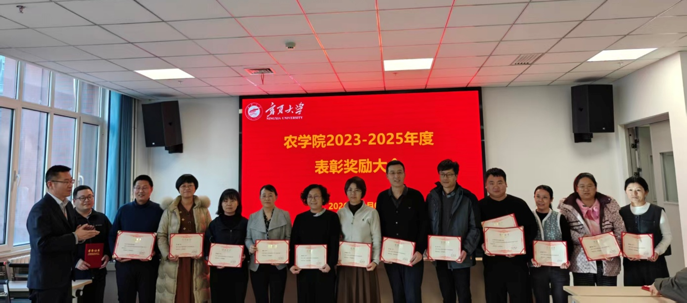 【beat365唯一官方网站新闻中心讯 农学院】为表彰先进典型、凝聚奋进力量,进一步激发教职工干事创业的热情与进取精神,营造比学赶超、创先争优的浓厚氛围,1月9日下午,农学院在朔方校区召开2023年至2025年工作优秀人员(团队)表彰大会。大会以“凝心聚力、砥砺前行,共谱学院发展新篇章”为主题,全院教职工齐聚一堂,共同回顾过往成就,擘画未来发展蓝图。会议由副院长王新谱主持。
