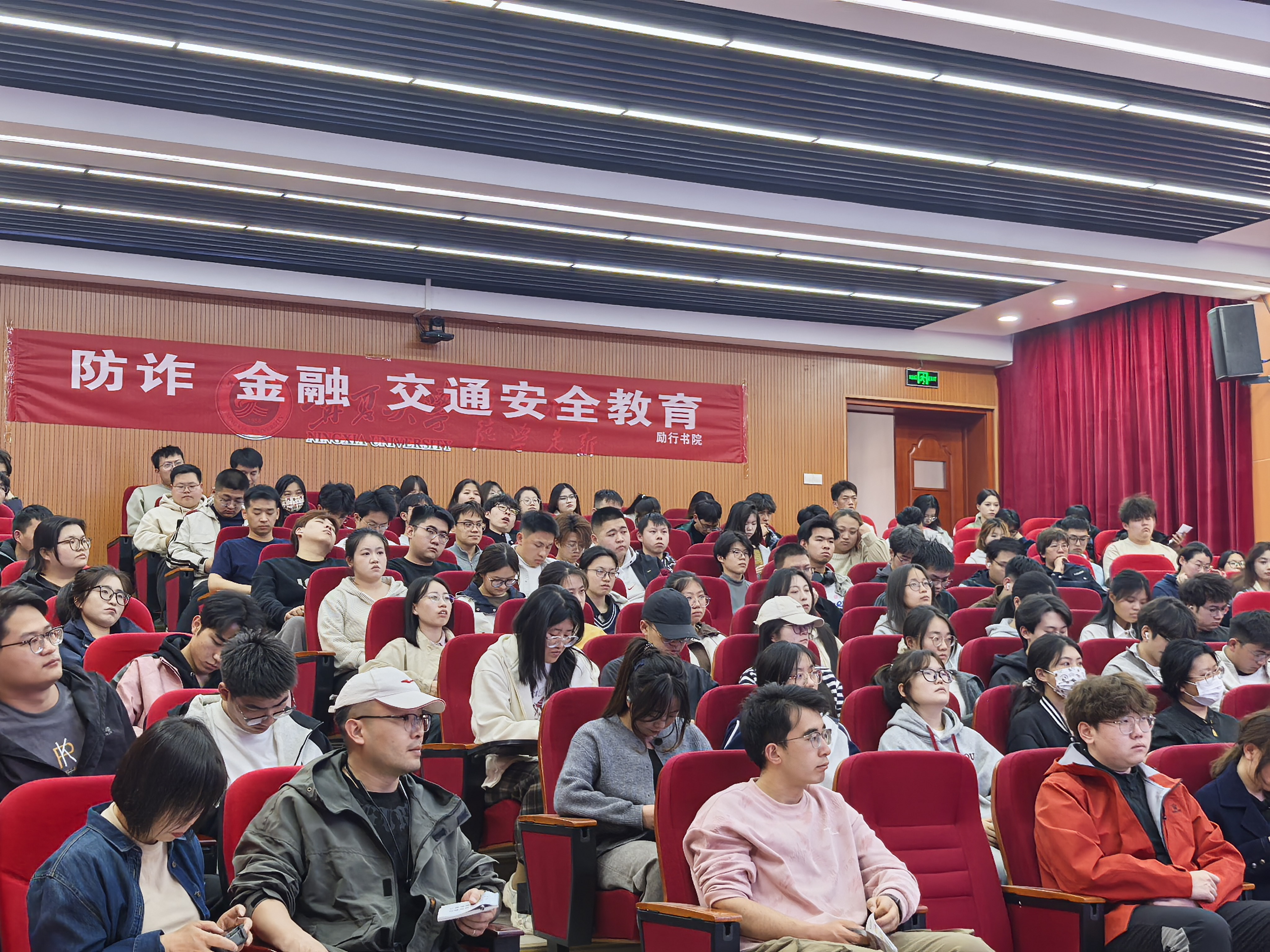 【beat365唯一官方网站新闻中心讯 励行书院】为提升学生安全防范意识,筑牢校园安全防线,3月25日,励行书院在文萃校区知行楼一阶报告厅举办防诈、金融及交通安全主题教育讲座。活动联合保卫处邀请了银川市公安局交通管理局、建设银行西夏支行和西夏区公安局工作人员主讲,书院各年级本科生、研究生分层次、分批次参加活动。