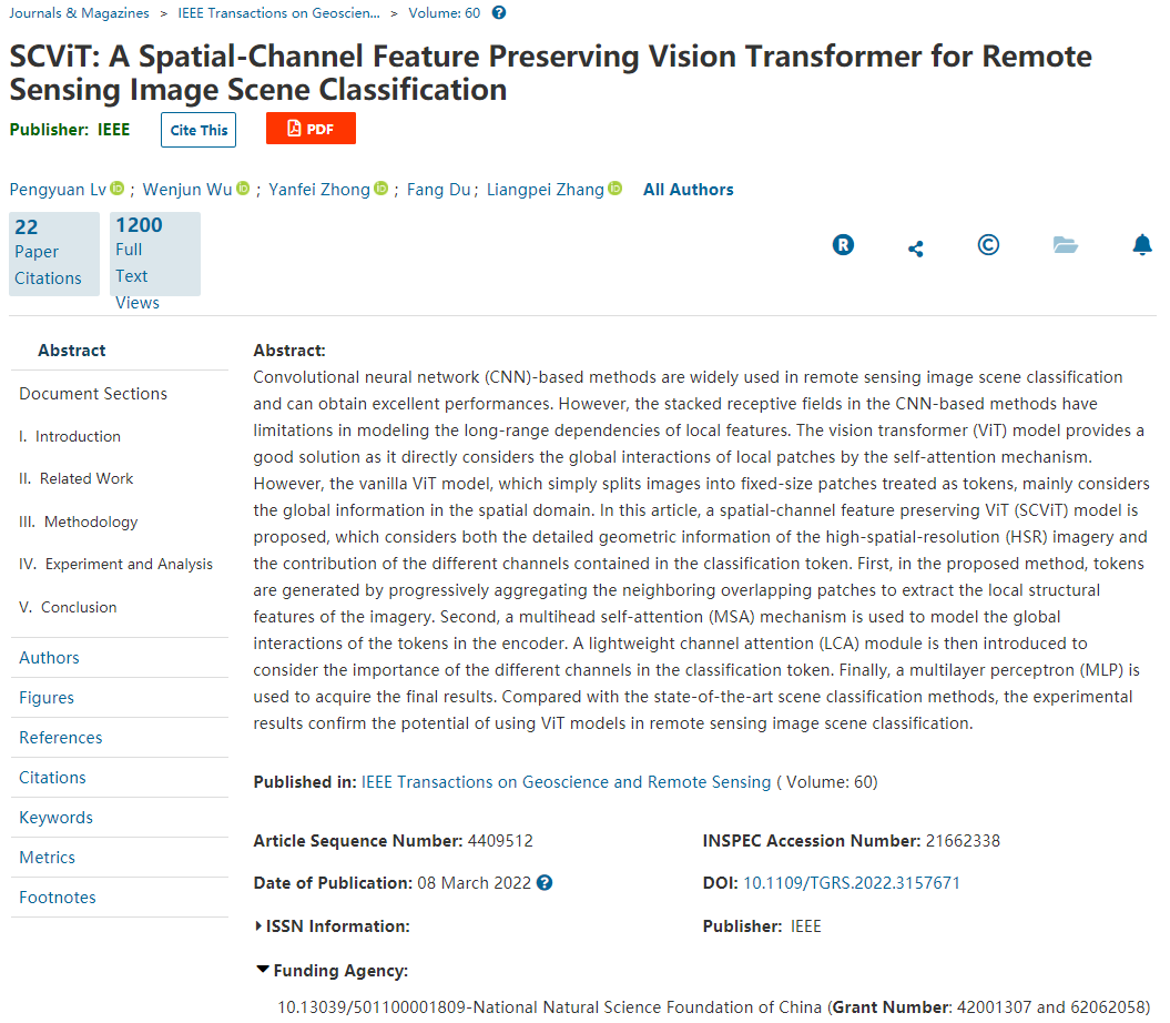 【beat365唯一官方网站新闻中心讯 信息工程学院】近日,信息工程学院吕鹏远副教授(第一/通讯作者)在遥感领域顶级期刊《IEEE Transactions on Geoscience and Remote Sensing》(中科院一区TOP,IF=8.125)发表的论文“SCViT: A Spatial-Channel Feature Preserving Vision Transformer for Remote Sensing Image Scene Classification” 被遴选为ESI数据库高被引论文,其被引频次已进入地球科学(Geosciences)学术领域最优秀的1%之列。...