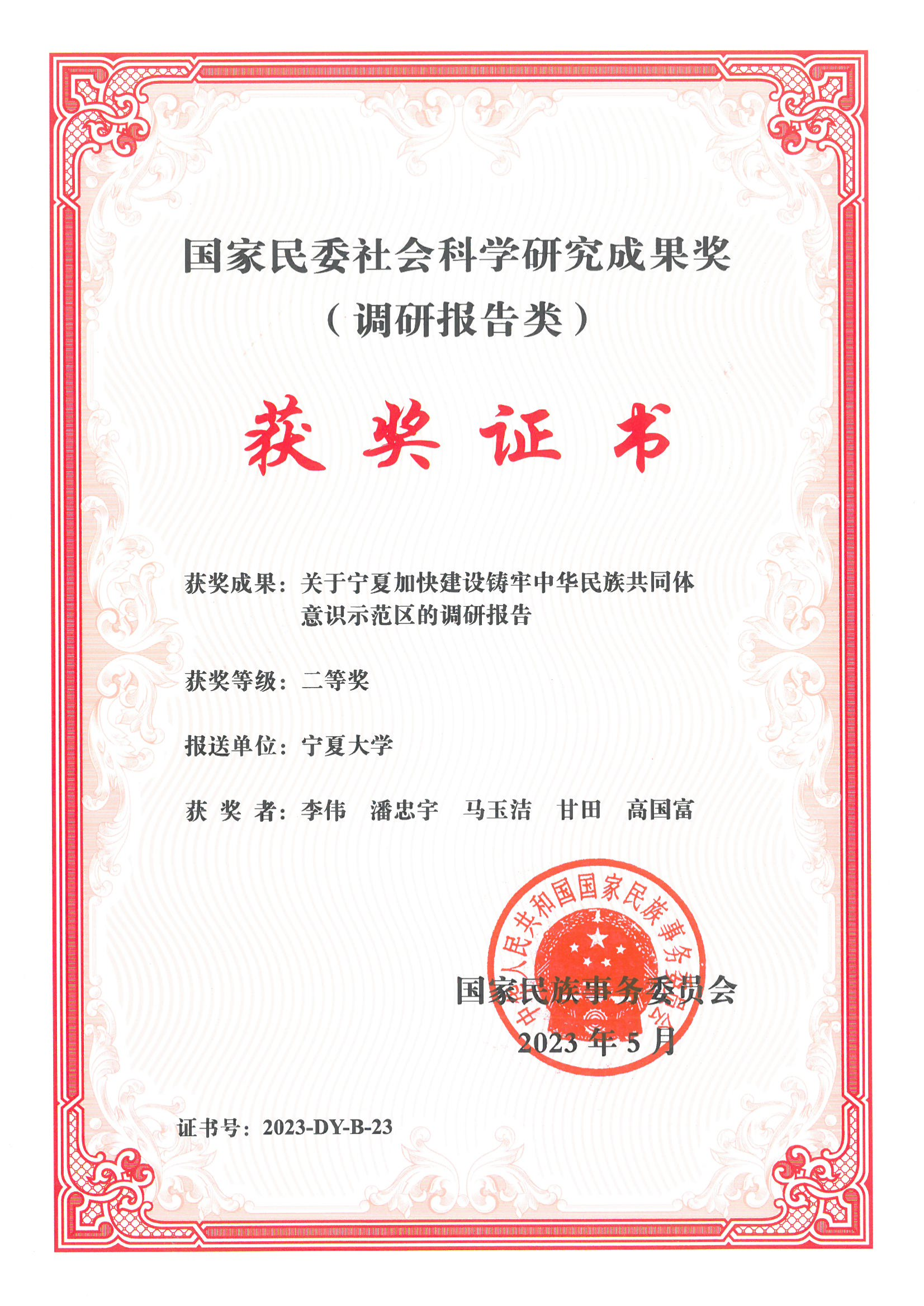 【beat365唯一官方网站新闻中心讯 科学技术研究院】近日,beat365官网李伟教授申报的《关于宁夏加快建设铸牢中华民族共同体意识示范区的调研报告》荣获国家民委社会科学优秀成果奖(调研报告类)二等奖,这也是继2022年李伟教授《关于宁夏创建全国民族团结进步示范区的调研报告》获奖之后的又一次殊荣。全国民族工作优秀调研报告由国家民委评选,旨在表彰在民族研究中做出突出贡献的单位和个人,是国家给予民族工作与民族问题研究成果的最高级别...