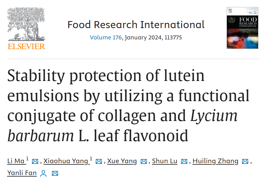 【beat365唯一官方网站新闻中心讯 食品科学与工程学院】近日,食品科学与工程学院食品营养与健康创新团队范艳丽教授课题组在Food Research International(1区,IF8.1)发表题为“Stability protection of lutein emulsions by utilizing a functional conjugate of collagen andLycium barbarumL.leaf flavonoid”的研究性论文(胶原蛋白和枸杞叶黄酮的功能复合物对叶黄素乳液稳定性的保护作用)。叶黄素具有良好的生物学功能,但其物理和...