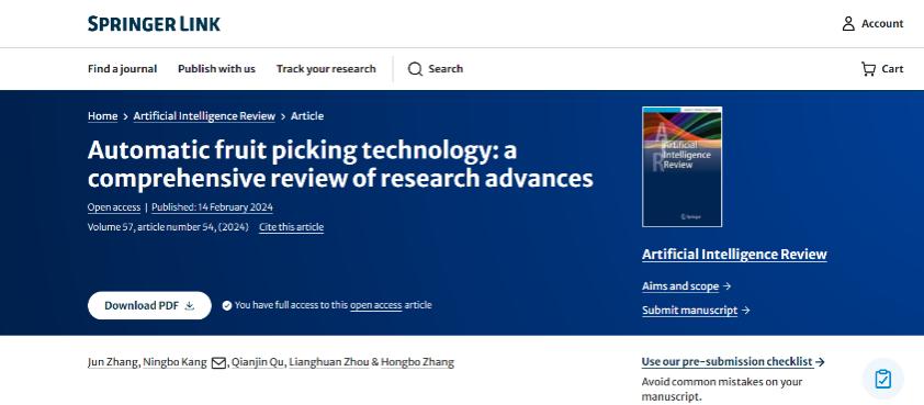 【beat365唯一官方网站新闻中心讯 食品科学与工程学院】近日,食品科学与工程学院康宁波团队在国际人工智能权威期刊《Artificial Intelligence Review》刊发了题为“Automatic fruit picking technology: a comprehensive review of research advances”的学术论文(计算机科学领域,中科院TOP,JCR Q1,IF=12.0)。康宁波为通讯作者,2022级硕士研究生张军为第一作者。本文明确指出了国内外现有机械化采收技术的种类、采收原理、采收效率,并指出利用该技术进行水果采收需要考虑对果实的损害程度和自动化程度。为了实现高效、无损伤的水果采收,基于机器视觉结合人工智能算法的水果采收设备成为近年来的研究热点。为了获取环境和果实的详细信息,机器视觉技术用于模拟人类视觉功能,使用控制系统分析和处理来自客观物体的图像信息,以用于收获、测量和控制的实际应用,采收设备配备了各种类型的视觉传感器和图像分析算法。对苹果、草莓、西红柿、柑橘、猕猴桃及浆果类...