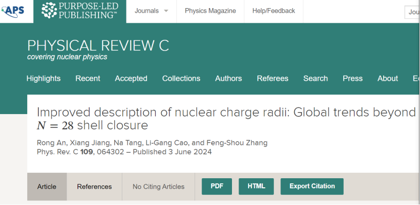 【beat365唯一官方网站新闻中心讯 物理学院】近日,物理学院理论物理组青年教师安荣博士和唐娜博士与深圳大学蒋翔博士、北京师范大学曹李刚教授以及张丰收教授,在美国物理协会权威期刊《Physical Review C》上发表题为《Improved description of nuclear charge radii: Global trends beyond N=28 shell closure》的原创性论文。文章通过引入中子和质子之间的关联性,提出了描述原子核电荷半径变化趋势的较为可靠的方法。文中指出,通过同...