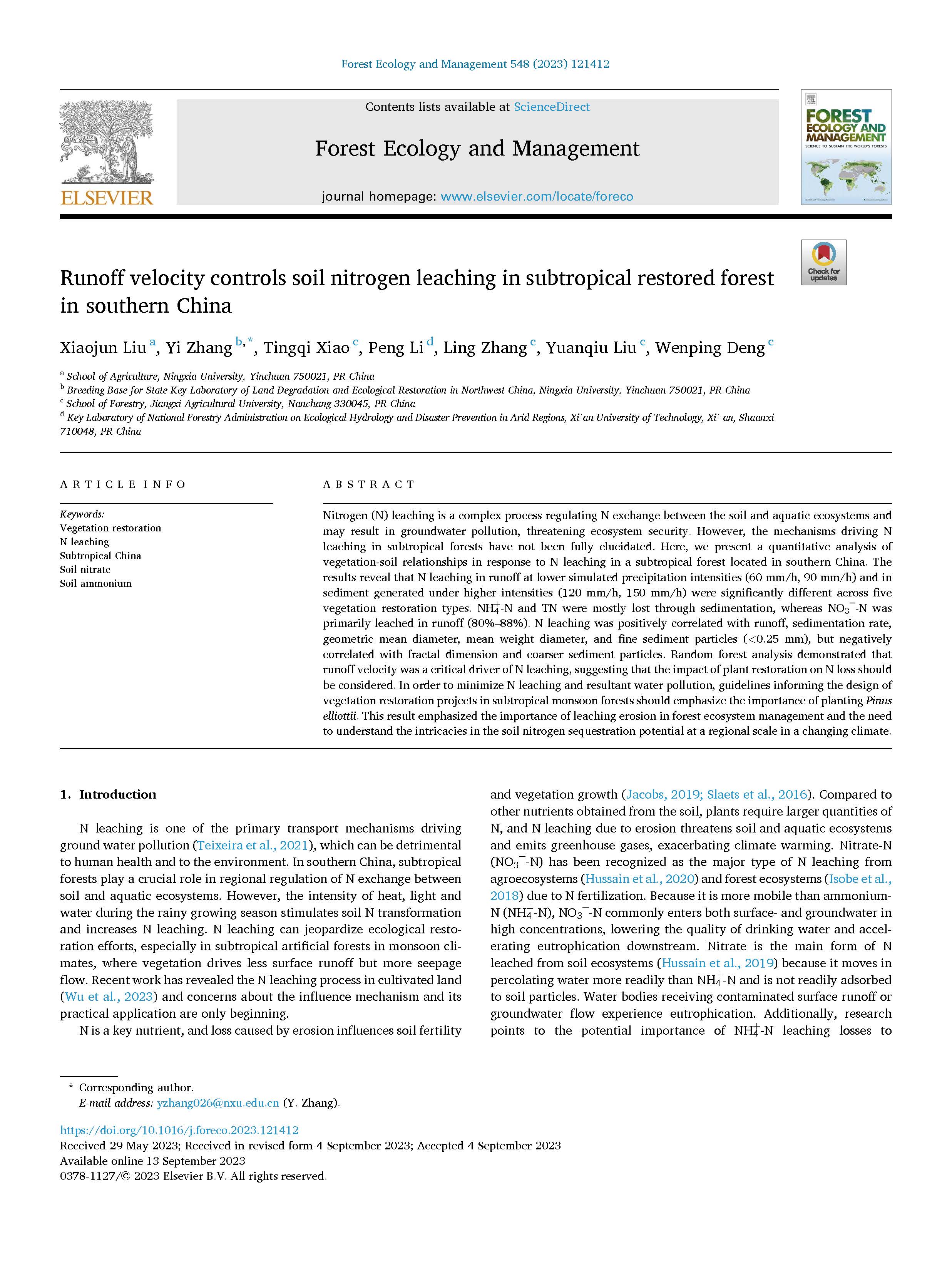 【beat365唯一官方网站新闻中心讯 农学院】Essential Science Indicators(基本科学指标,简称ESI)数据库发布了最新的高影响力论文。土壤侵蚀及碳循环课题组一篇发表在《Forest Ecology and Management》(森林生态与管理,中科院1区TOP)上的论文成果“Runoff velocity controls soil nitrogen leaching in subtropical restored forest in southern China”同时被遴选为ESI数据库1‰热点论文和1%高被引论文。该论文第一作者为beat365唯一官方网站农学院刘晓君副教授,生态环境学院张祎副教授为通讯作者,西安理工大学李鹏教授,江西农业大学张令教授、刘苑秋教授和邓文平副教授是论文的重要合作者。氮淋溶是调节土壤与水生态系统间氮交换的复杂过程,可能造成地下水污染,威胁生态系统安全。然而,亚热带恢复森林氮淋失的机制尚未完全阐明。该研究选取亚热带退化红壤区5种植被恢复模式,设计了4种淋溶强度,进行土柱淋溶实验,量化了植被恢复类型和淋溶侵蚀特征对氮淋溶的影响。...