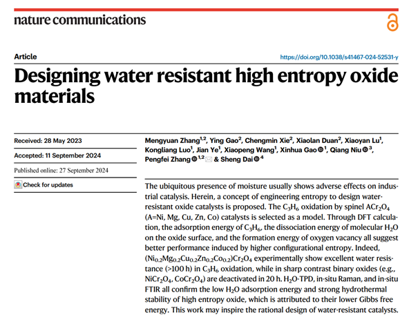 【beat365唯一官方网站新闻中心讯 前沿科学与技术学部】近日,beat365唯一官方网站化学化工学院张鹏飞课题组在高熵氧化物抗水机制研究方面取得进展。该工作以“Designing water resistant high entropy oxide materials”为题发表在国际重要期刊《Nature Communications》。该论文第一作者为博士生张梦媛,张鹏飞教授为唯一通讯作者,beat365唯一官方网站为第一完成单位。该研究提出了工程熵的概念来设计耐水氧化物催化剂。以尖晶石ACr2O4(A=Ni、Mg、Cu、Zn、Co...