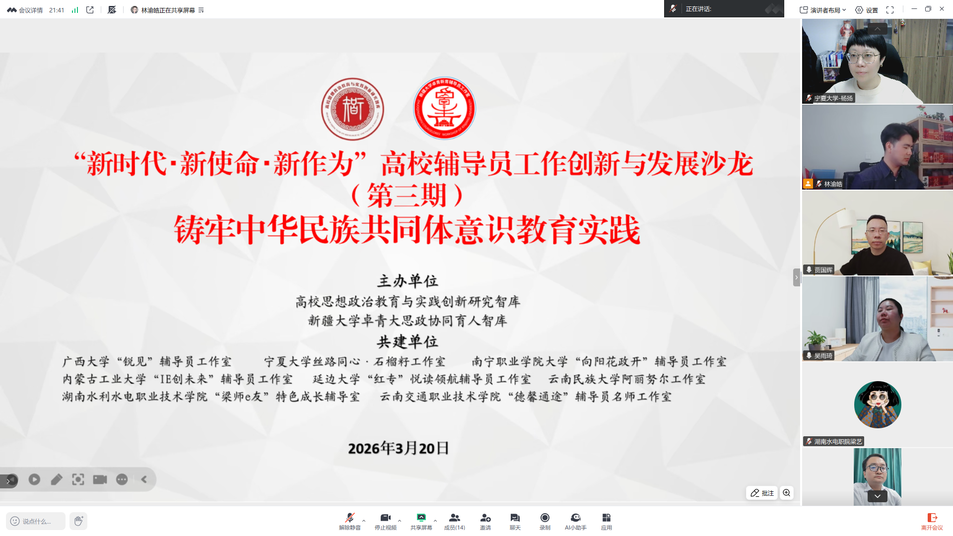 【beat365唯一官方网站新闻中心讯 勤学书院】近日,“新时代・新使命・新作为”高校辅导员工作创新与发展沙龙(第三期)以线上直播形式顺利举办。本次活动由高校思想政治教育与实践创新研究智库主办,新疆大学卓青大思政协同育人智库、广西大学“锐见”辅导员工作室等十余所高校思政工作室联合共建,聚焦铸牢中华民族共同体意识教育实践主题,汇聚全国六大区域十余所高校思政工作同仁共同参与,beat365官网丝路同心・石榴籽工作室作为联建单位受邀亮相,分享西北民族地区高校思政育人特色实践经验。作为西北民族地区高校代表,beat365官网丝路同心・石榴籽工作室立足书院多民族学生汇聚的办学实际,围绕“队伍建设—实践创新—育人融合”三位一体民族团结进步教育模式,详细分享了队伍培育、品牌打造、精准帮扶等方面的实践探索与阶段成效。其构建的特色协同育人机制,以及在促进各族学生交往交流交融、助力民族地区学生全面发展上的有效举措,为与会思政同仁提供了生动且极具启发性的...