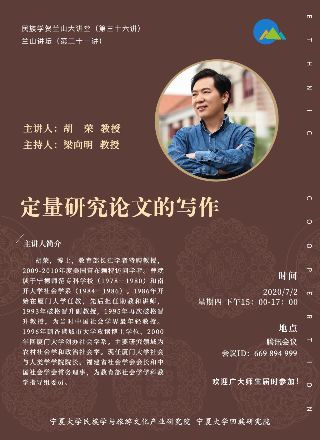 胡荣,博士,教育部长江学者特聘教授,2009-2010年度美国富布赖特访问学者。曾就读于宁德师范专科学校(1978-1980)和南开大学社会学系(1984-1986)。1986年开始在厦门大学任教,先后担任助教和讲师,1993年破格晋升副教授,1995年再次破格晋升教授,为当时中国社会学界最年轻教授。1996年到香港城市大学攻读博士学位,2000年回厦门大学创办社会学系。主要研究领域为农村社会学和政治社会学。现任厦门大学社会与人类学学院院长、福建省社会学会会长和中国社会学会常务理事,为教育部社会学学科教学指导组委员。