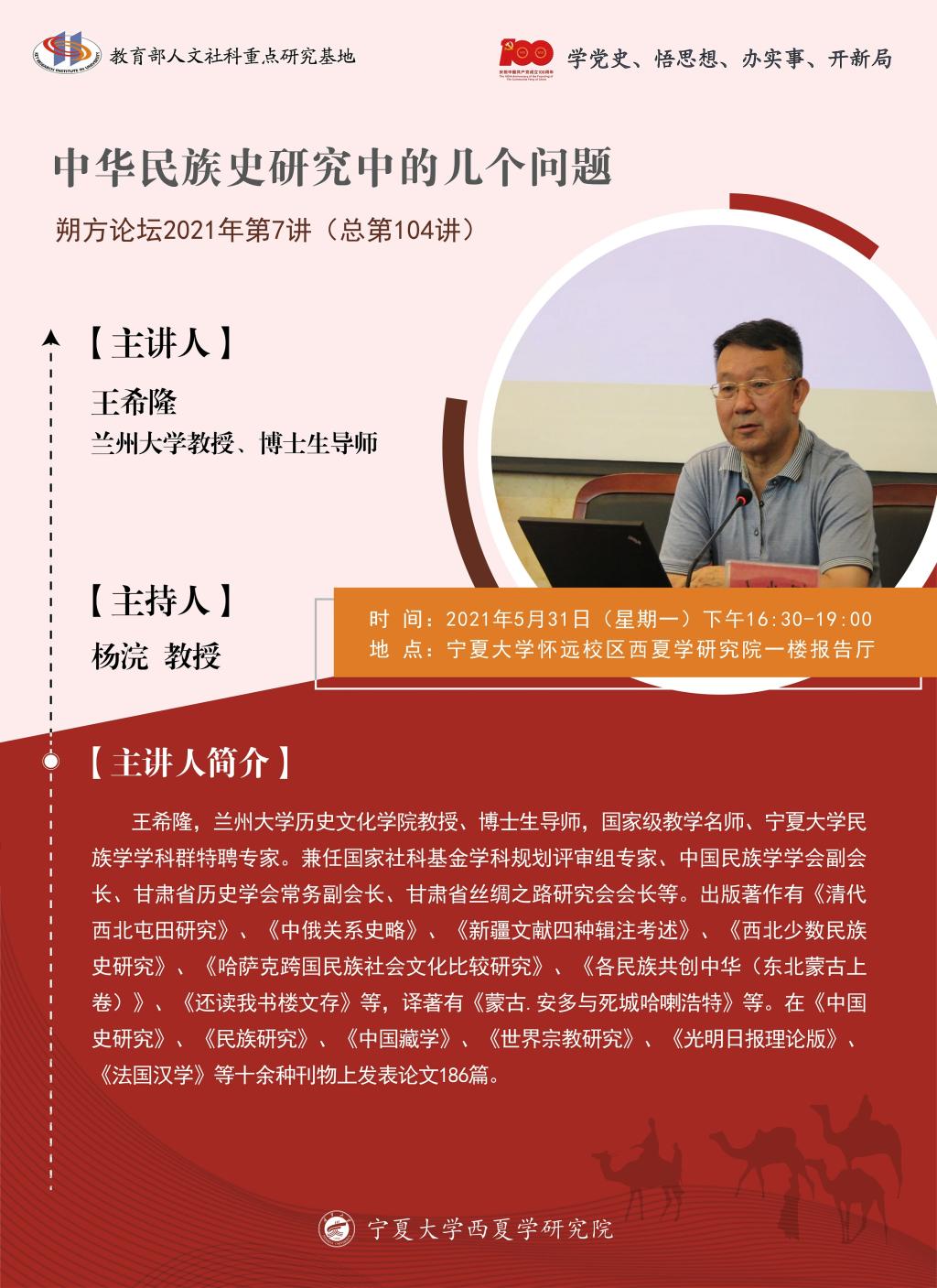 王希隆,兰州大学历史文化学院教授、博士生导师,国家级教学名师、beat365唯一官方网站民族学学科群特聘专家。兼任国家社科基金学科规划评审组专家、中国民族学学会副会长、甘肃省历史学会常务副会长、甘肃省丝绸之路研究会会长等。出版著作有《清代西北屯田研究》、《中俄关系史略》、《新疆文献四种辑注考述》、《西北少数民族史研究》、《哈萨克跨国民族社会文化比较研究》、《各民族共创中华(东北蒙古上卷)》、《还读我书楼文存》等,译著有《蒙古.安多与死城哈喇浩特》等。在《中国史研究》、《民族研究》、《中国藏学》、《世界宗教研究》、《光明日报理论版》、《法国汉学》等十余种刊物上发表论文186篇。