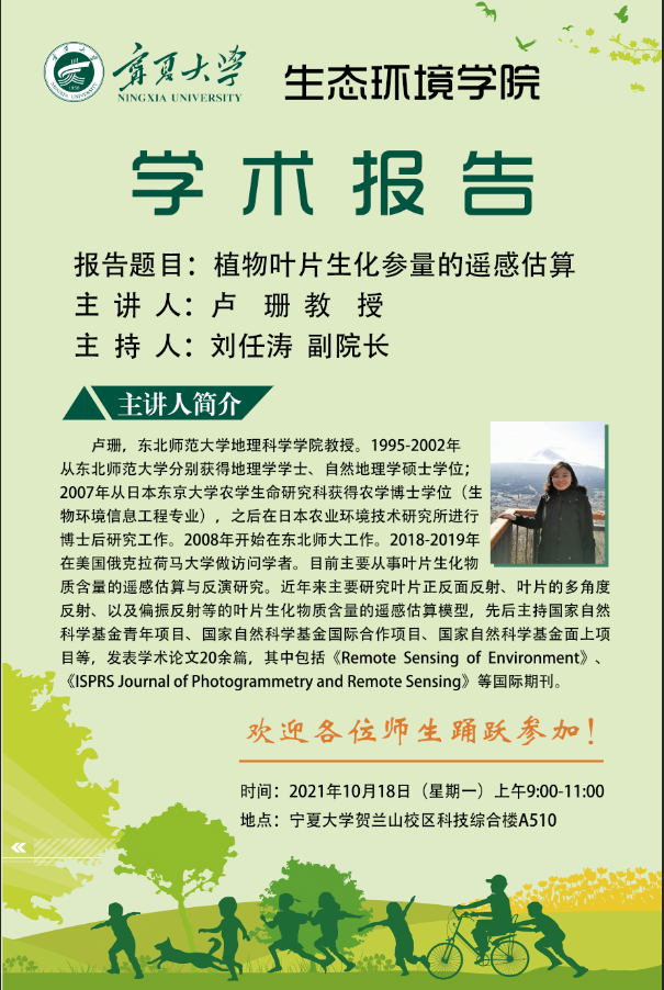 卢珊,东北师范大学地理科学学院教授。1995-2002年从东北师范大学分别获得地理学学士、自然地理学硕士学位;2007年从日本东京大学农学生命研究科获得农学博士学位(生物环境信息工程专业),之后在日本农业环境技术研究所进行博士后研究工作。2008年开始在东北师大工作。2018-2019年在美国俄克拉荷马大学做访问学者。目前主要从事叶片生化物质含量的遥感估算与反演研究。近年来主要研究叶片正反面反射、叶片的多角度反射、以及偏振反射等的叶片生化物质含量的遥感估算模型,先后主持国家自然科学基金青年项目、国家自然科学基金国际合作项目、国家自然科学基金面上项目等,发表学术论文20余篇,其中包括《Remote Sensing of Environment》、《ISPRS Journal of Photogrammetry and Remote Sensing》等国际期刊。