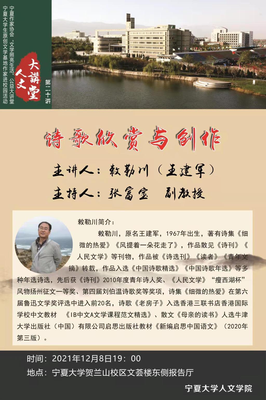敕勒川是具有全国影响力的主流诗人,也是自治区宣传部柔性引进的高端人才。此次讲座是宁夏文联、宁夏作协举办的“文学照亮生活”公益大讲堂年度系列活动之一。敕勒川将结合自身诗歌创作情况,分享创作经验和诗歌欣赏方式,指导诗歌创作路径,具有前沿性和实践性,对于提高师生诗歌爱好者的诗歌欣赏和创作水平及活跃校园文化氛围都有积极意义。