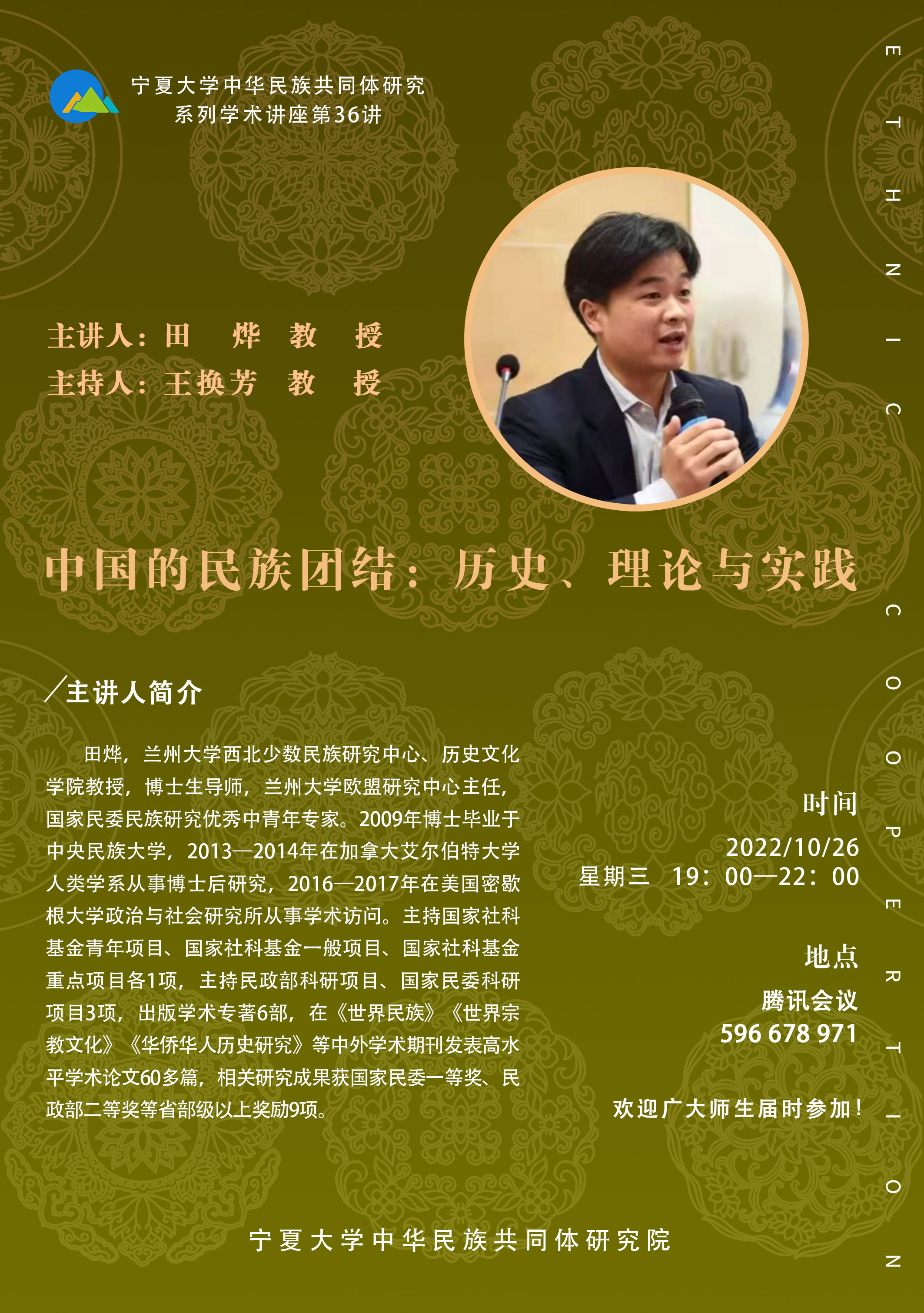 田烨,兰州大学西北少数民族研究中心/历史文化学院教授,博士生导师,兰州大学欧盟研究中心主任,国家民委民族研究优秀中青年专家。2009年博士毕业于中央民族大学,2013—2014年在加拿大艾尔伯特大学人类学系从事博士后研究,2016—2017年在美国密歇根大学政治与社会研究所从事学术访问。主持国家社科基金青年项目、国家社科基金一般项目、国家社科基金重点项目各1项,主持民政部科研项目、国家民委科研项目3项,出版学术专著6部,在《世界民族》《世界宗教文化》《华侨华人历史研究》等中外学术期刊发表高水平学术论文60多篇,相关研究成果获国家民委一等奖、民政部二等奖等省部级以上奖励9项。