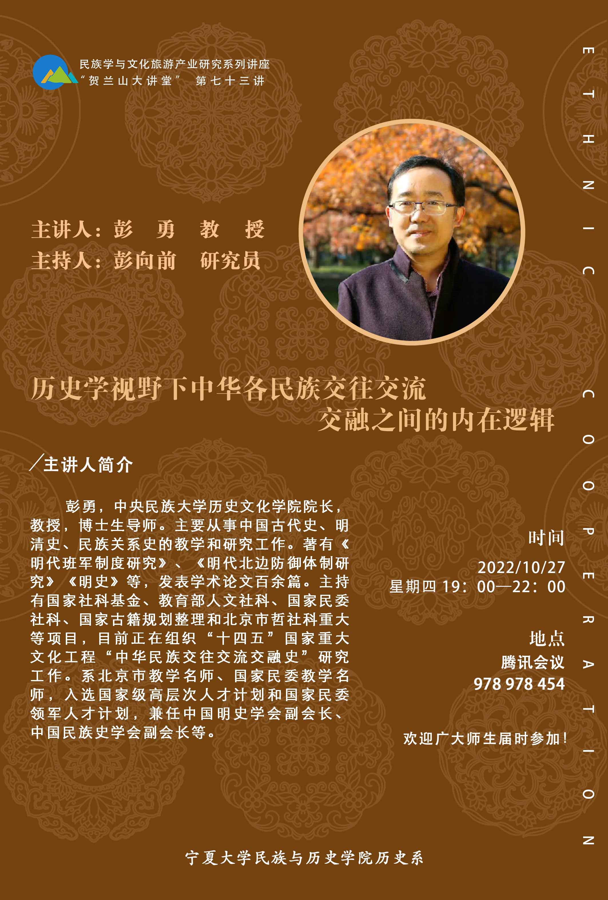 彭勇,中央民族大学历史文化学院院长,教授,博士生导师。主要从事中国古代史、明清史、民族关系史的教学和研究工作。著有《明代班军制度研究》、《明代北边防御体制研究》《明史》等,发表学术论文百余篇。主持有国家社科基金、教育部人文社科、国家民委社科、国家古籍规划整理和北京市哲社科重大等项目,目前正在组织“十四五”国家重大文化工程“中华民族交往交流交融史”研究工作。系北京市教学名师、国家民委教学名师,入选国家级高层次人才计划和国家民委领军人才计划,兼任中国明史学会副会长、中国民族史学会副会长等。