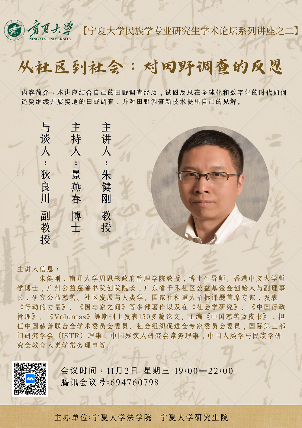 朱健刚,南开大学周恩来政府管理学院教授,博士生导师。香港中文大学哲学博士,广州公益慈善书院创院院长,广东省千禾社区公益基金会创始人与副理事长,研究公益慈善、社区发展与人类学。国家社科重大招标课题首席专家,发表《行动的力量》、《国与家之间》等多部著作以及在《社会学研究》《中国行政管理》《Voluntas》等期刊上发表150多篇论文。主编《中国慈善蓝皮书》,担任中国慈善联合会学术委员会委员、社会组织促进会专家委员会委员,国际第三部门研究学会(ISTR)理事,中国残疾人研究会常务理事,中国人类学与民族学研究会教育人类学常务理事等。