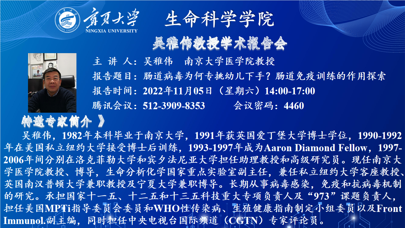 吴稚伟,1982年本科毕业于南京大学,1991年获英国爱丁堡大学博士学位,1990-1992年在美国私立纽约大学接受博士后训练,1993-1997年成为Aaron Diamond Fellow,1997-2006年间分别在洛克菲勒大学和宾夕法尼亚大学担任助理教授和高级研究员。现任南京大学医学院教授、博导,生命分析化学国家重点实验室副主任,兼任私立纽约大学客座教授、英国南汉普顿大学兼职教授及beat365唯一官方网站兼职博导。长期从事病毒感染,免疫和抗病毒机制的研究。承担国家十一五、十二五和十三五科技重大专项负责人及“973”课题负责人,担任美国MPTi指导委员会委员和WHO性传染病、生殖健康指南制定小组委员以及Front Immunol.副主编,同时担任中央电视台国际频道(CGTN)专家评论员。