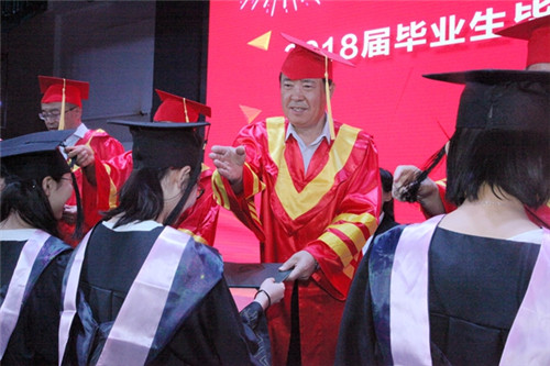在学位授予环节,学院2018届毕业生身着学位服依次走上主席台,与会领导为他们一一拨穂正冠、颁发证书,为大学生涯画上圆满句号。
