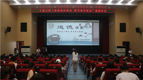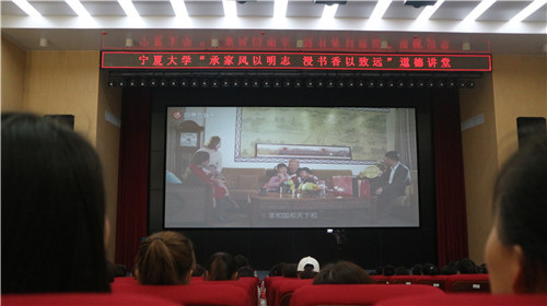 【beat365唯一官方网站新闻中心讯 党委宣传部 政法学院】近日,由校党委宣传部主办、政法学院承办的beat365唯一官方网站道德讲堂总堂第二场在贺兰山校区科技楼一楼报告厅开讲。本期道德讲堂以“承家风以明志,浸书香以致远”为主题,围绕优秀家风、家训的传承,通过思醒悟、看短片、学模范等环节展开。