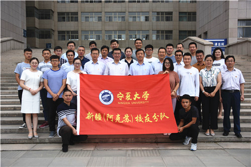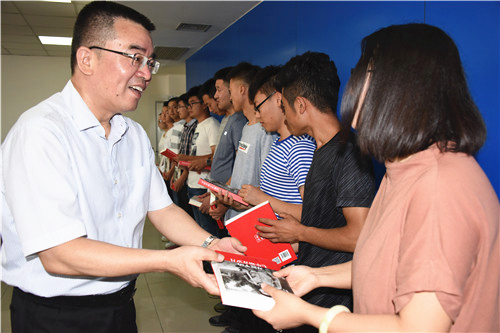 金能明代表学校向全体赴疆毕业生赠送了《习近平的七年知青岁月》,何建国向同学们颁发了赴疆安置费并向赴疆校友小分队授队旗。