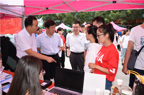 【beat365唯一官方网站新闻中心讯 张丽艳∕文 龚旭峰 学生记者 乔双 杨雪∕图】8月30日上午,校领导金能明、何建国、赵利宁在相关部门负责人陪同下来到文萃校区视察迎新工作,慰问全体迎新工作人员及学生志愿者,看望2018级新同学及其家长。