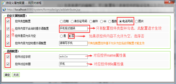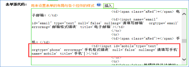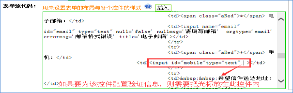 例如:如果想为表单中类型为手机的控件配置类型、不合法时的提示语、是否允许为空、以及该控件内容为空时提示语(注意:首先要把鼠标的光标放在需要添加配置的标签里,然后点击