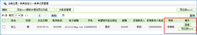 在网站内容管理的表单自定义节点下,点击左侧对应表单的名字节点,可以浏览该表单在前台所提交的所有表单信息,如(图2-8),也可以点击每条数据对应的