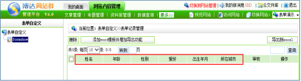 (2)前台用户提交的表单信息可以在后台内容管理点击表单名称节点,用户提交的表单信息管理如图3-0。