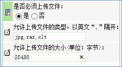 如果表单中需要上传文件但不是必须,可以不用配置,如果必须要上传文件,选是。上传的文件格式以英文”,” 逗号隔开,例如:jpg,rar,xlt。