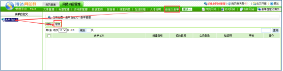 在网站内容管理中打开“表单自定义”功能,点击“表单自定义”节点,打开表单列表,在列表上方点击“增加”按钮出现新增表单页(图2-1)