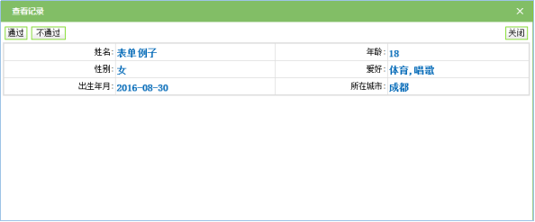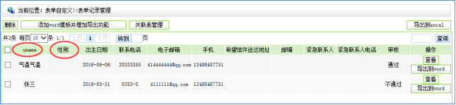 Ø tilte:可选属性,在每个控件中title属性是对应在后台查看表单记录时页面显示的表格标题信息。如果该控件不存在title属性,那么标题默认对应name属性值。如图一所示,姓名控件中因为没有title属性,所以在图3-0中标题则显示为name的属性的值uname,而性别控件因为有了title属性,图3-0性别则会显示title属性的值。因此title属性是可选的。